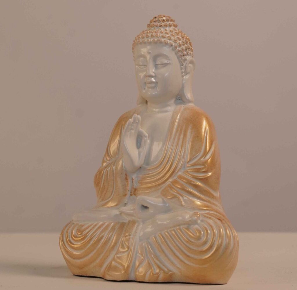 Meditating Buddha Idols for Home Decor Ashirwad Mudra White Gold Shading Small Size Office Desk Table Outdoor Resin Statues L W H ( 14*8*19) cm