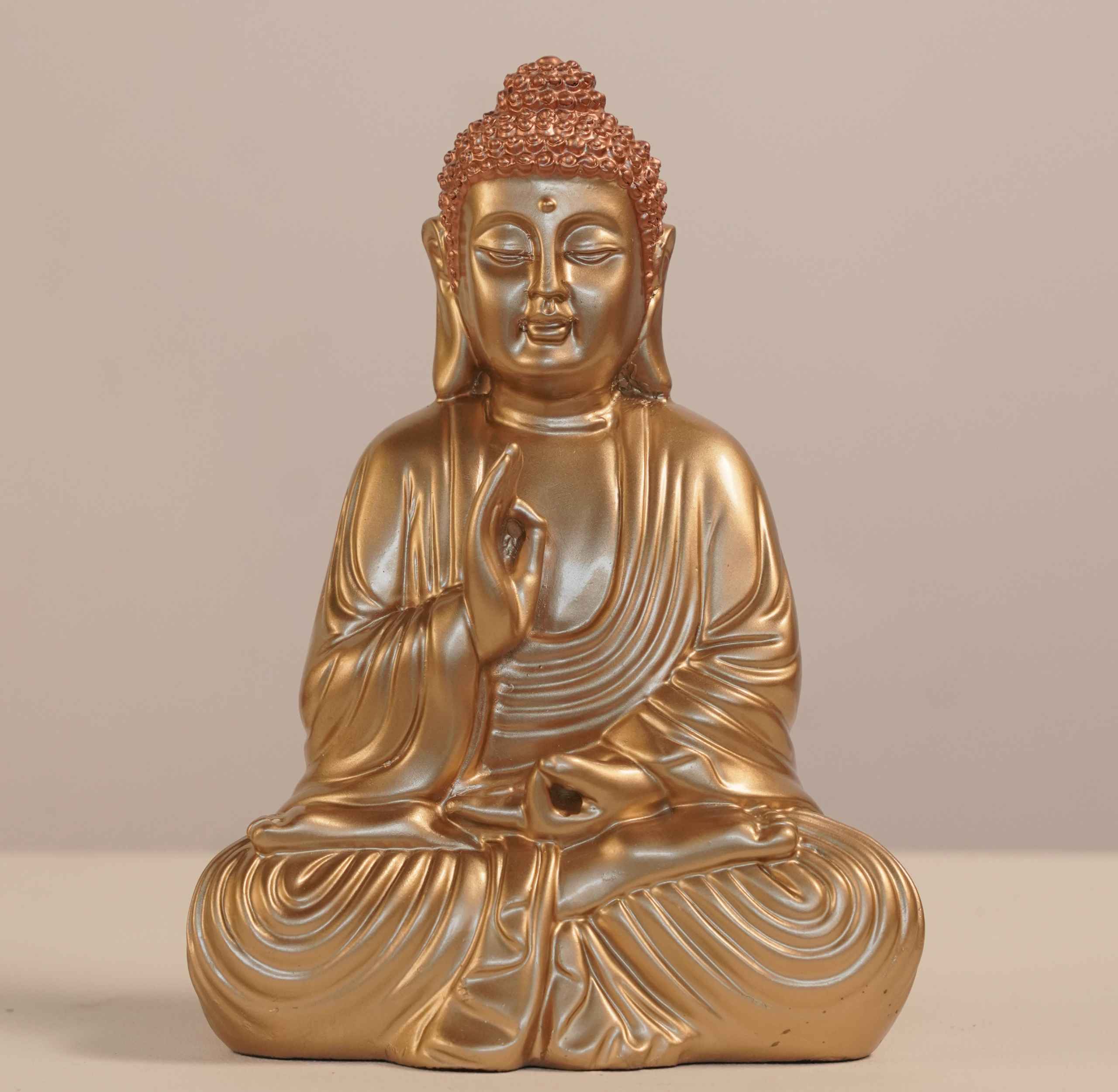 1 review for Meditating Buddha Idols for Home Decor Ashirwad Mudra Pale Gold Small Size Office Desk Table Outdoor Resin Statues L W H ( 14*8*19) cm